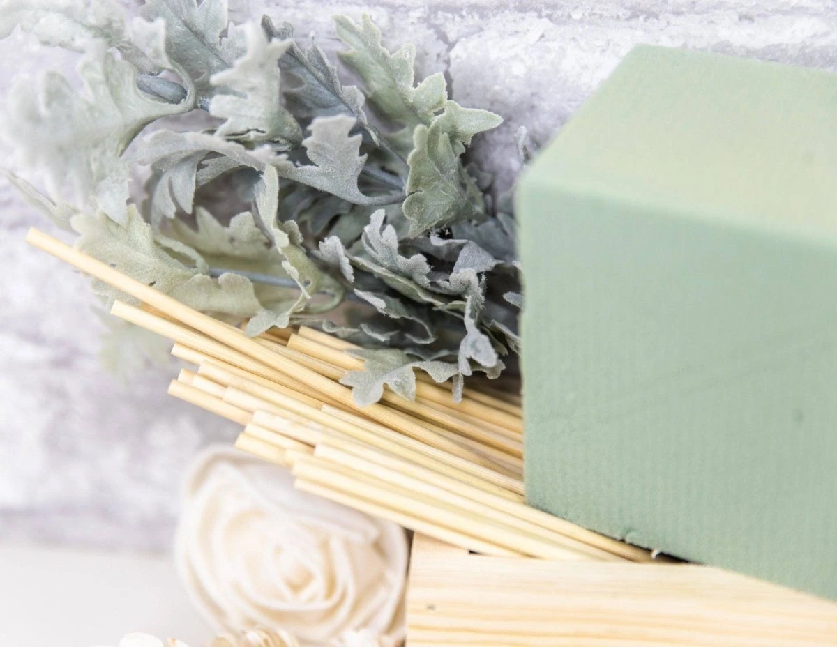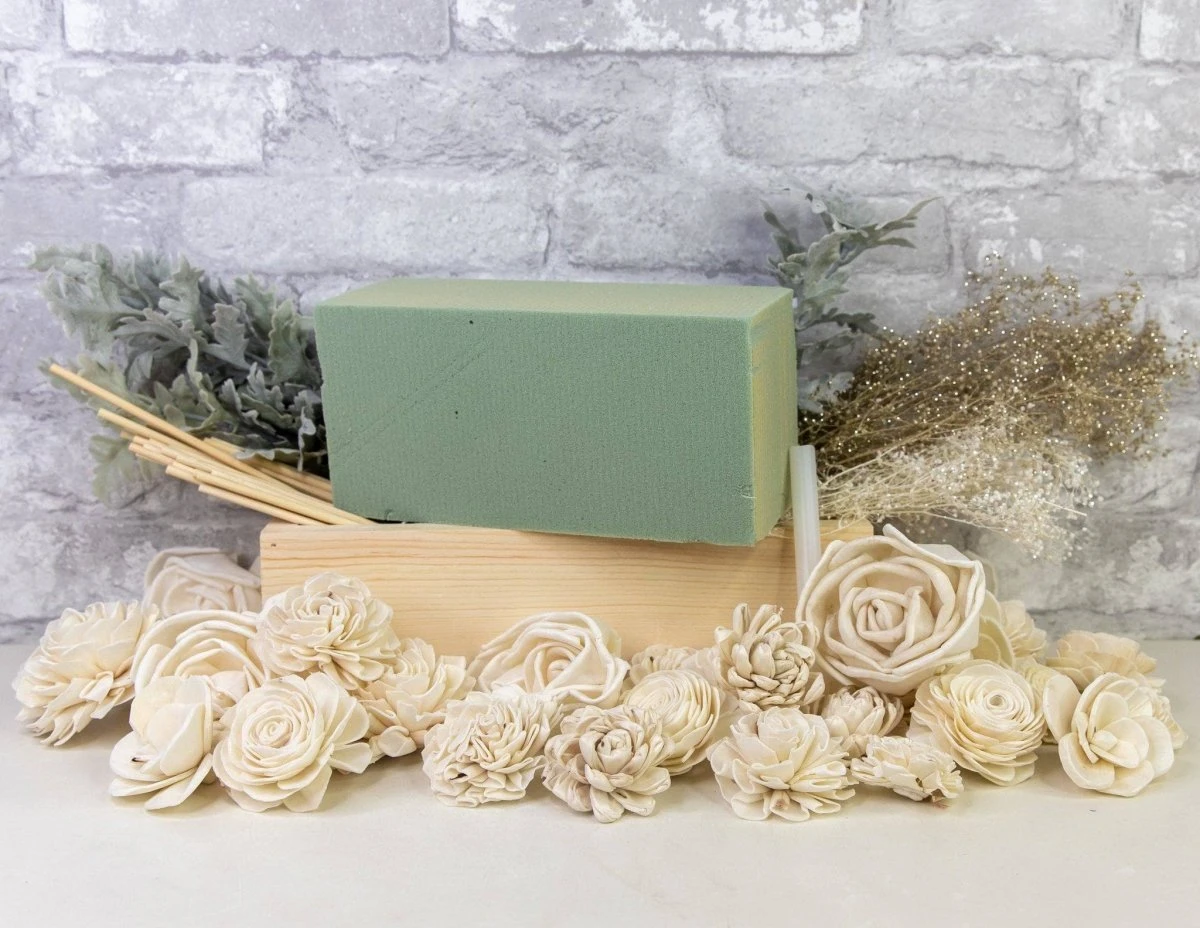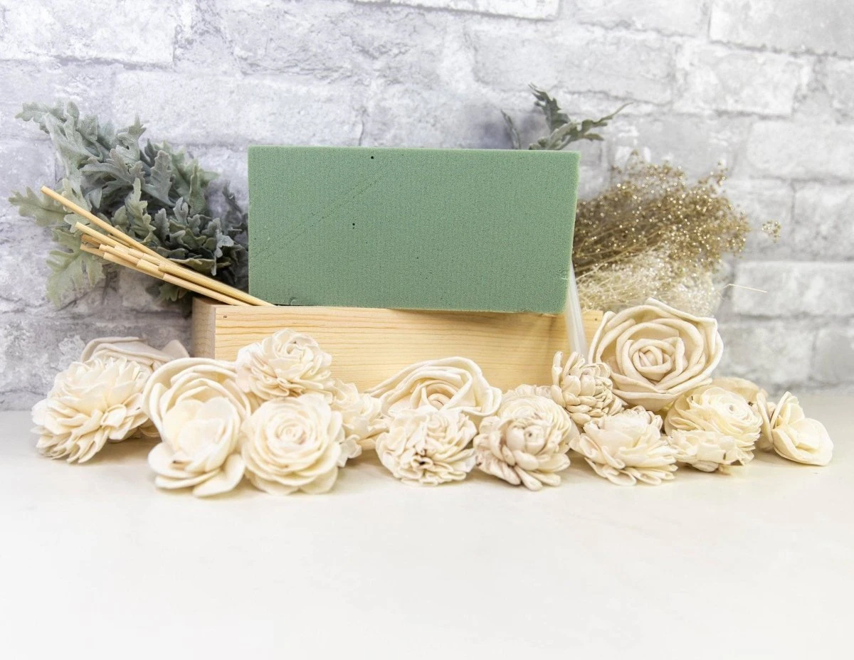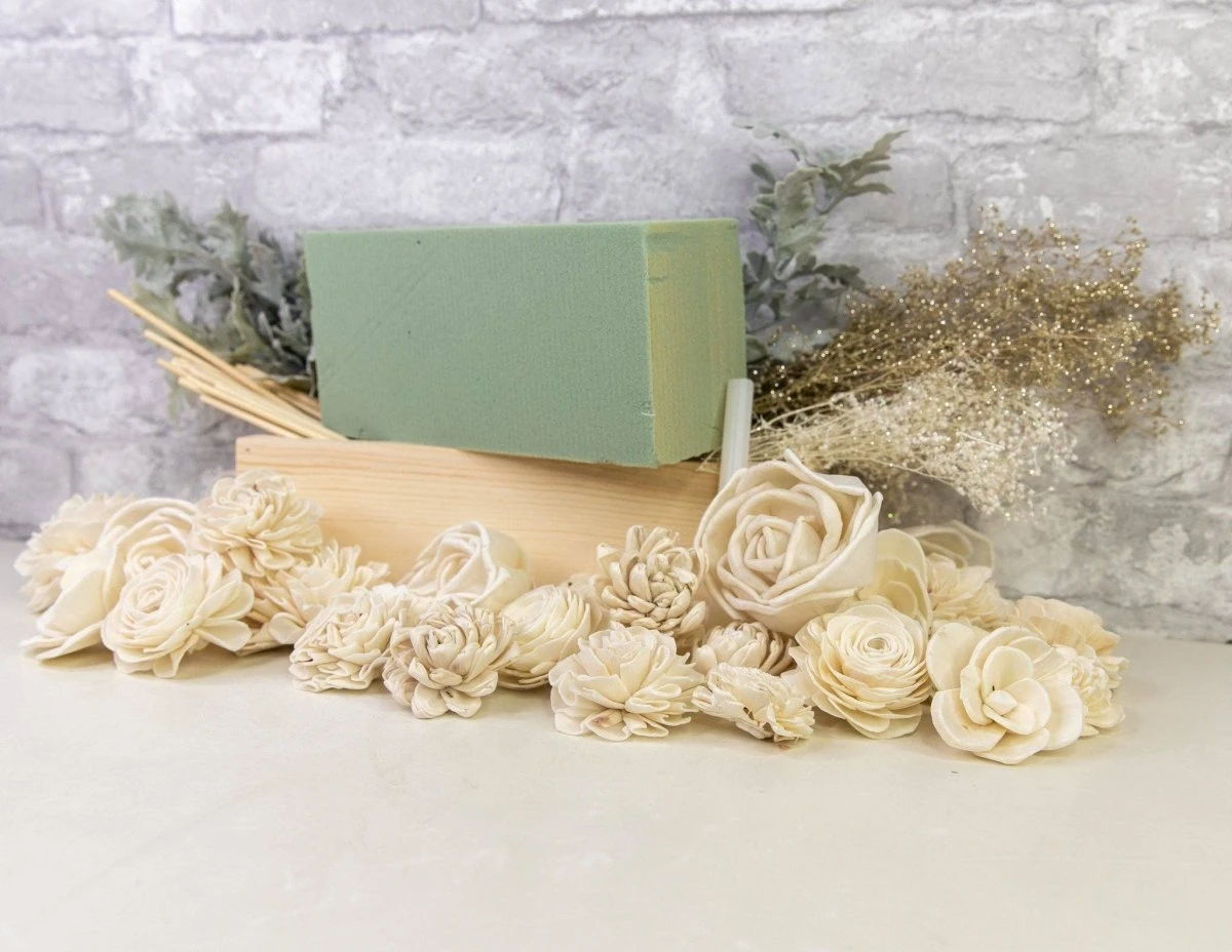 This gorgeous bouquet is giving us all the vintage vibes! The gorgeous fillers are simple, sparkly, and stunning! This centerpiece kit includes everything you need to create a gorgeous centerpiece. In the example shown we used the colors Powder Pink, Ivory, Weathered Grey, and we left some flowers raw (undyed). You can choose from our 50+ color options and dye as many, or as few, flowers as you would like.