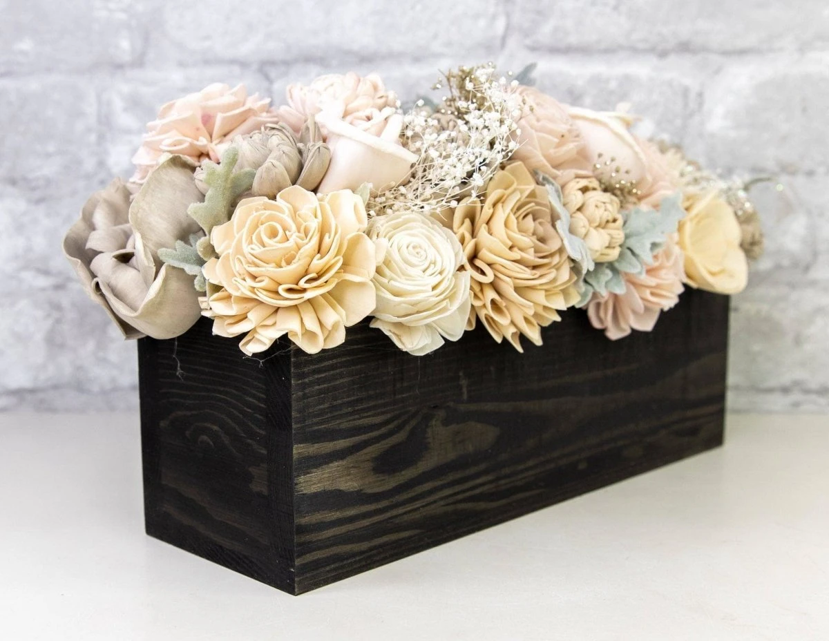 The colors used in the finished example shown are Powder Pink, Ivory, Silver, and Raw (No Dye). The stain we used for the centerpiece box is Black.