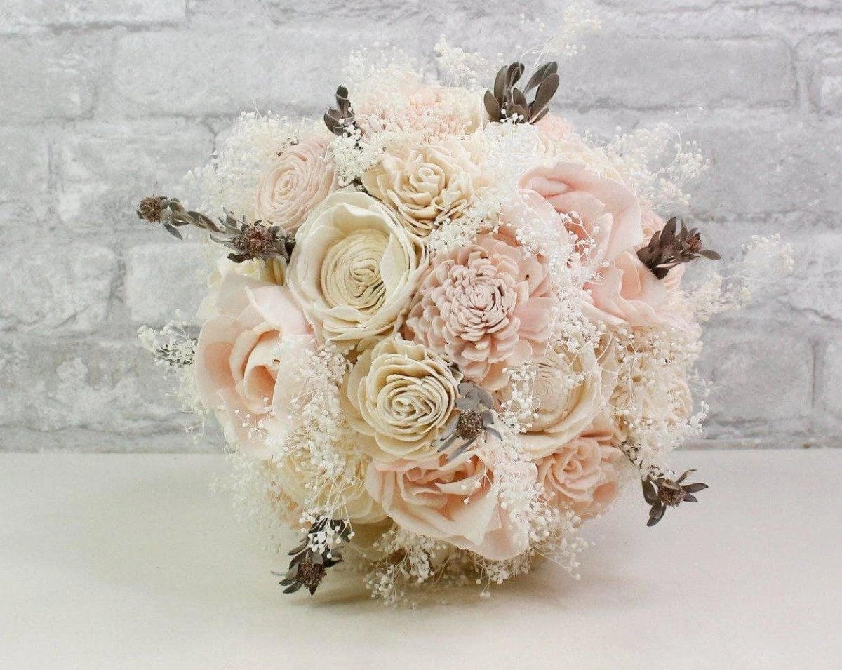 This gorgeous bouquet is made of our gorgeous Baby’s Breath White, Pubescens Bundle greenery/filler and best selling sola wood flowers dyed in colors Powder Pink and Raw (No Dye).