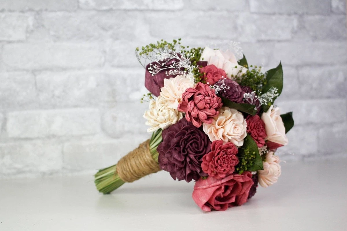 The Blushing Beauty bouquet is absolutely gorgeous. The beautiful assortment of sola wood flowers dyed in the colors Powder Pink, Eggplant, Burgundy, and Raw (No Dye) is perfectly paired with 3 types of our most popular Bleached Baby’s Breath, Mini Gyp Green, Salal preserved greenery/fillers giving this bouquet a larger than life look!