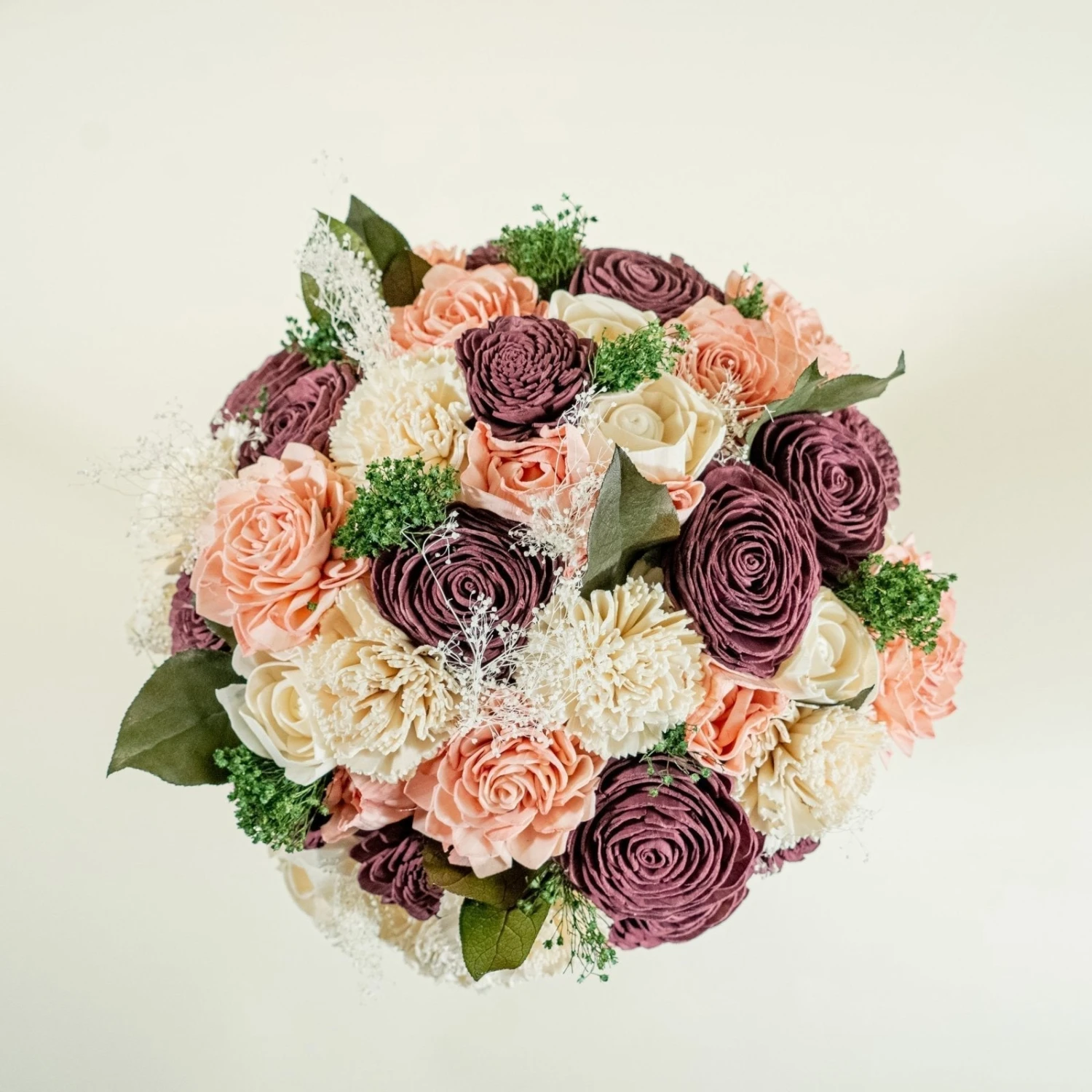 The Blushing Beauty bouquet is absolutely gorgeous. The beautiful assortment of sola wood flowers dyed in the colors Powder Pink, Eggplant, Burgundy, and Raw (No Dye) is perfectly paired with 3 types of our most popular Bleached Baby’s Breath, Mini Gyp Green, Salal preserved greenery/fillers giving this bouquet a larger than life look!