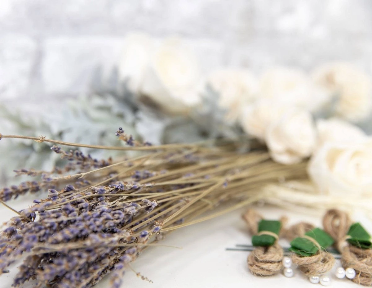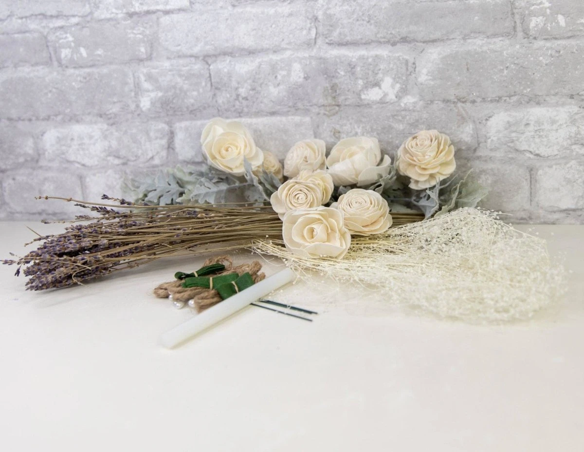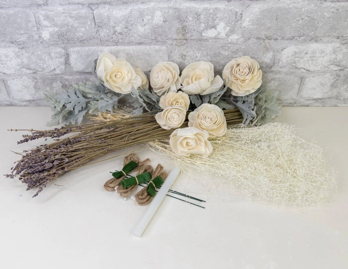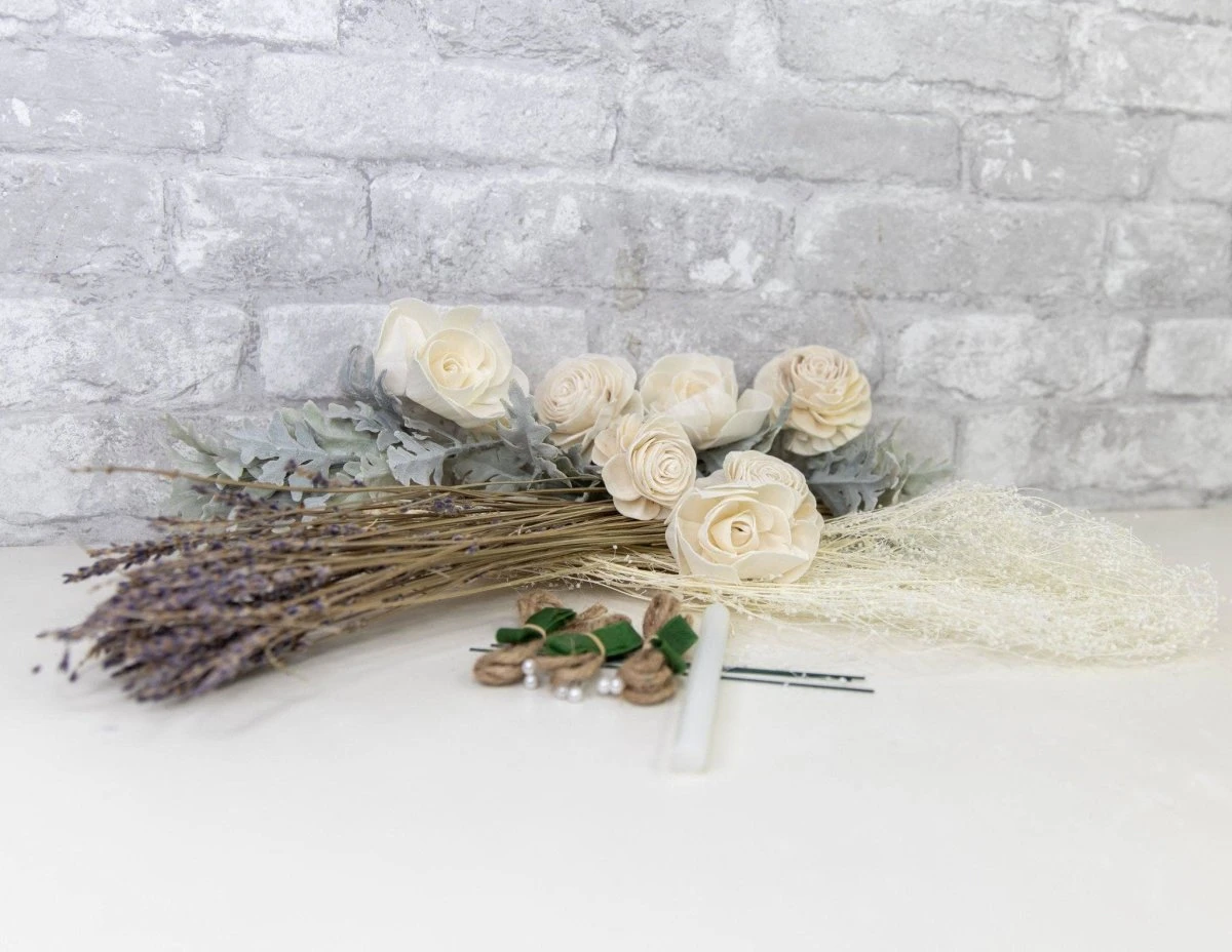 This vintage themed boutonniere kit will fit in perfectly at any wedding or event! The gorgeous combination of faux and preserved fillers with the wood flowers is simply stunning and give the bouquet that “old timey” feel.