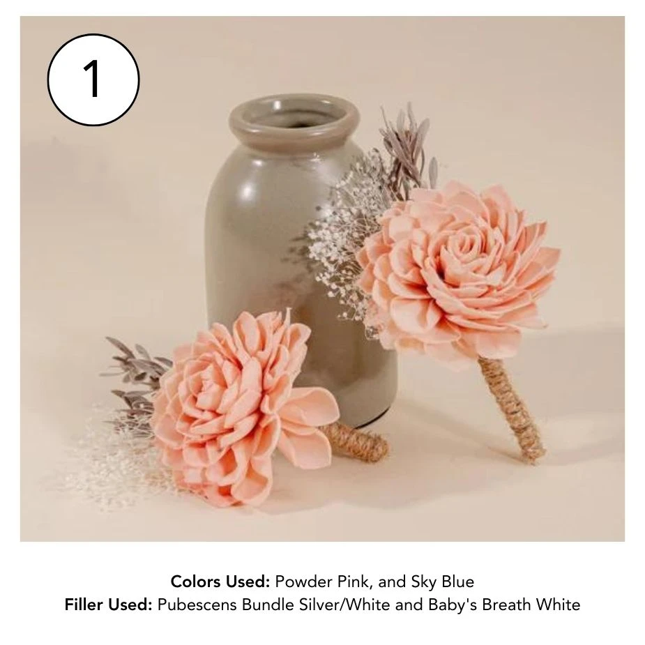 Boutonniere Set 1 – The colors used Powder Pink, and Sky Blue. The fillers used are Pubescens Bundle Silver/White and Baby’s Breath White.
