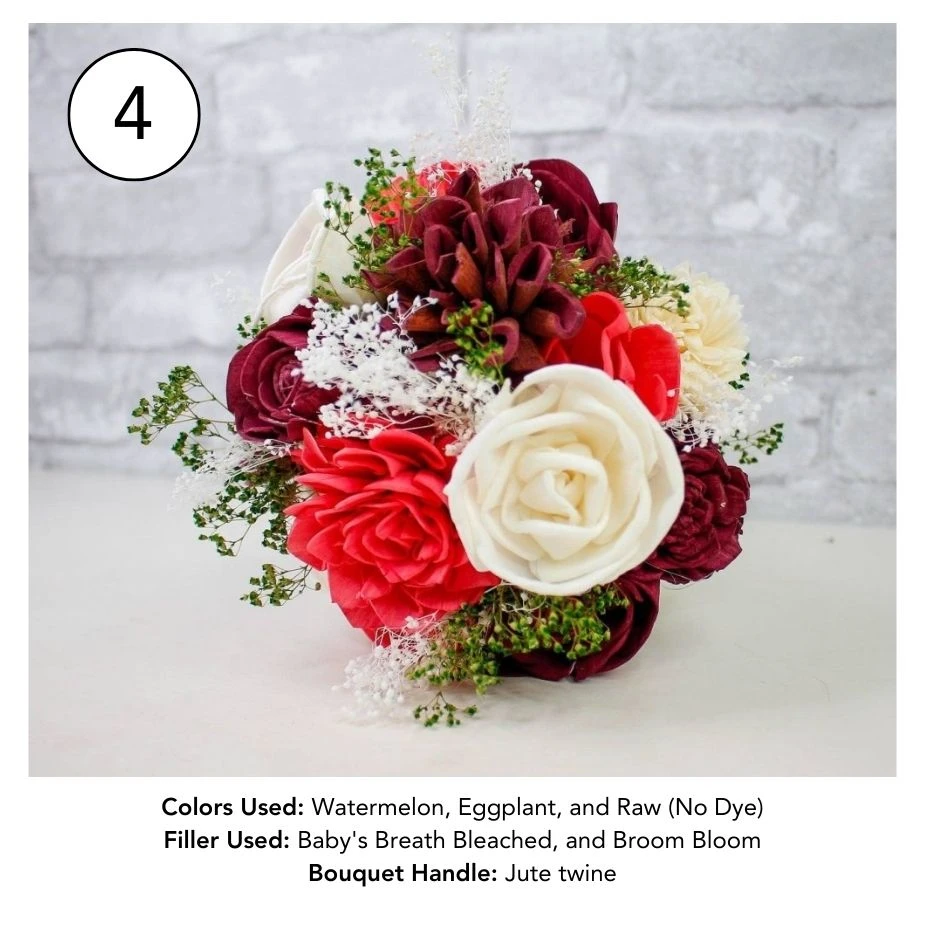 Bouquet 4 – The colors used in this bouquet are Watermelon, Eggplant, and Raw (No Dye). The fillers used are Baby’s Breath Bleached, and Broom Bloom. The handle is jute twine.