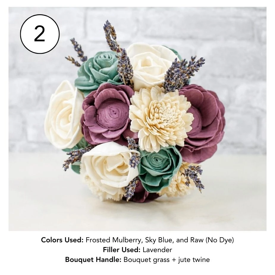 Bouquet 2 – The colors used in this bouquet are Frosted Mulberry, Sky Blue, and Raw (No Dye). The filler used is lavender. The handle for this bouquet is bouquet grass + jute twine.