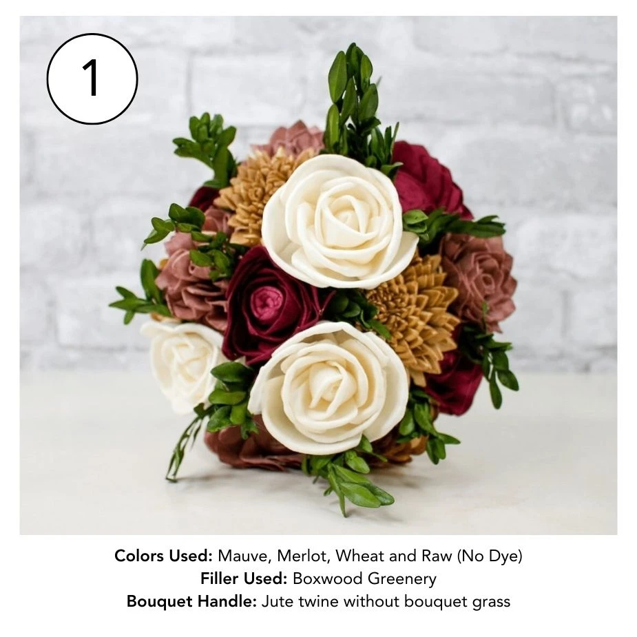 Bouquet 1 – The colors used in this bouquet are Mauve, Merlot, Wheat and Raw (No Dye). The filler used is Boxwood Greenery. The handle for this bouquet is jute twine without bouquet grass.
