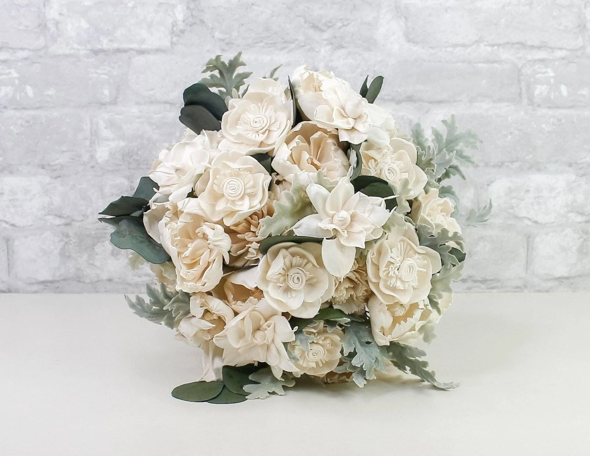 The new and improved Loretta Bridal Bouquet is a *show stopper*! The gorgeous green eucalyptus and dusty miller fillers are perfectly paired with a gorgeous assortment of our sola wood flowers. This bouquet is perfect for your wedding and will surely be a huge hit! This kit is perfect for the DIY bride looking for a gorgeous alternative to live flowers. This kit comes with everything you need to create a stunning bridal bouquet.