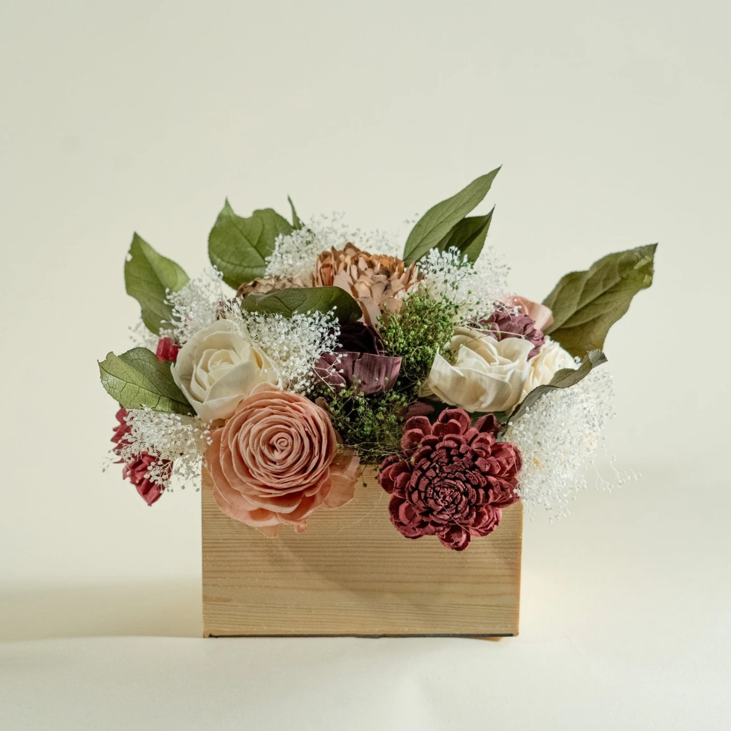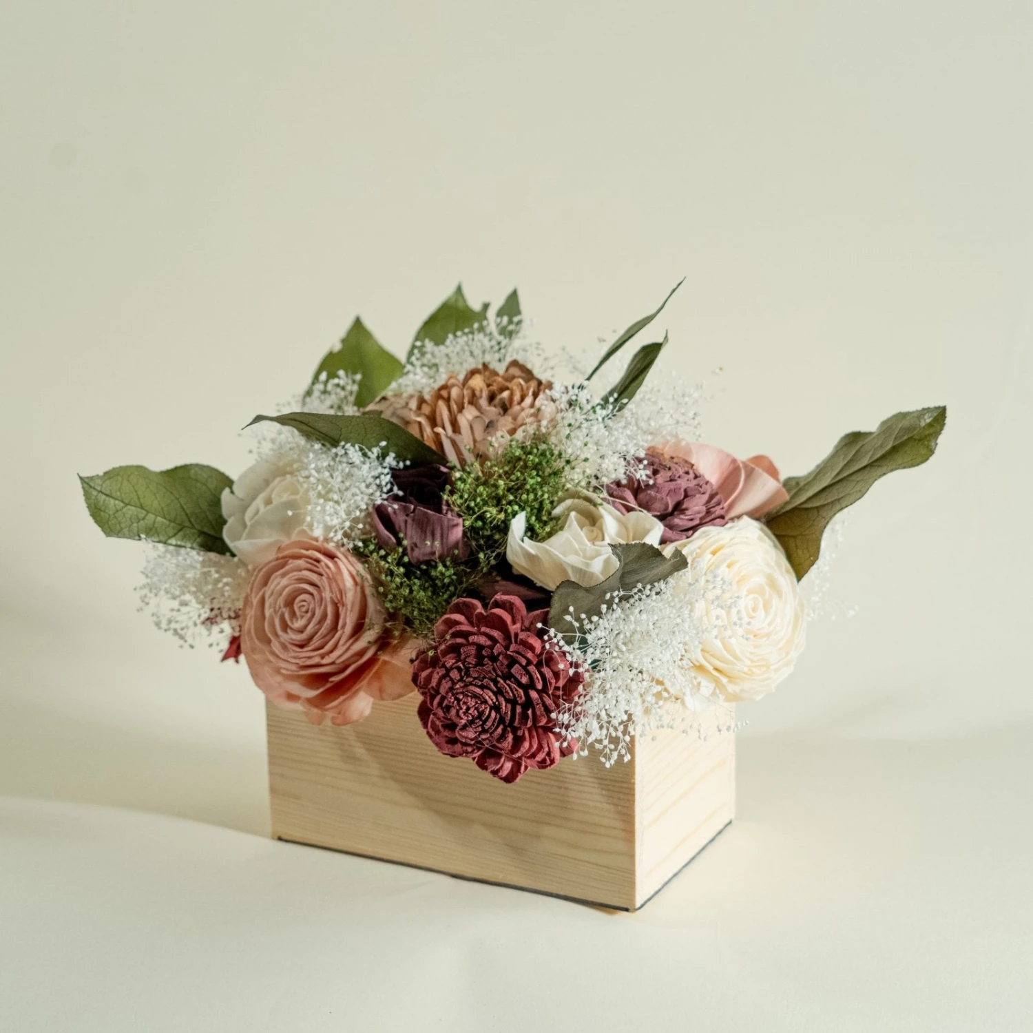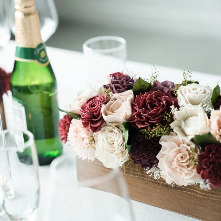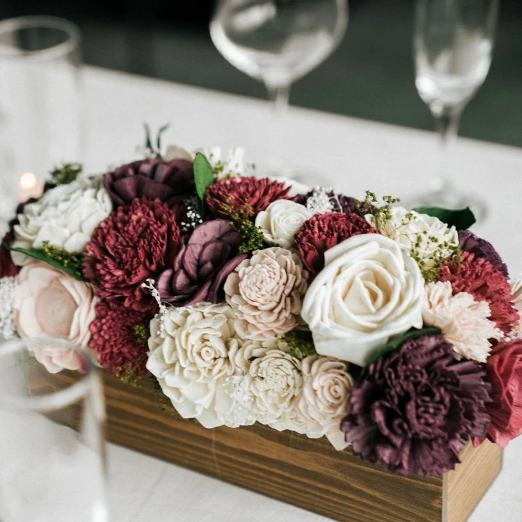 The colors used in the finished example shown are Powder Pink, Eggplant, Burgundy, and Raw (No Dye). The stain we used for the centerpiece box is Raw.