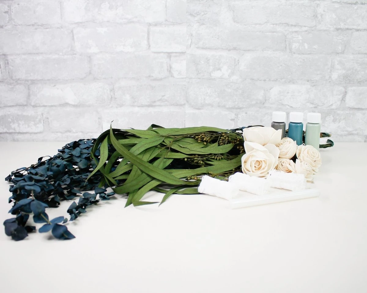 This kit is sure to be a favorite! The preserved willow eucalyptus, Satin washed eucalyptus give this kit a stunning look that you’re sure to love!