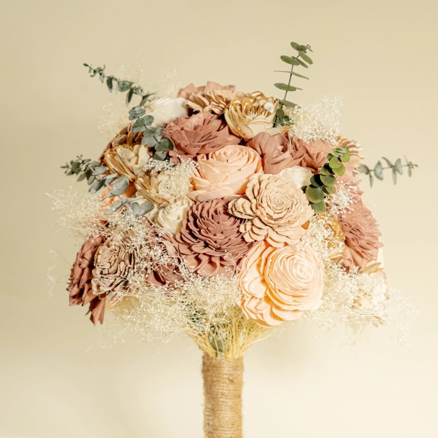The Pure Perfection bouquet is perfect for any occasion, big or small! This gorgeous bouquet features Spiral Green Eucalyptus and Baby’s Breath Bleached filler. The gorgeous assortment of sola wood flowers dyed in the colors Mauve, Powder Pink, Raw (No Dye) is perfect for your big day!