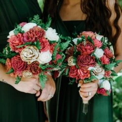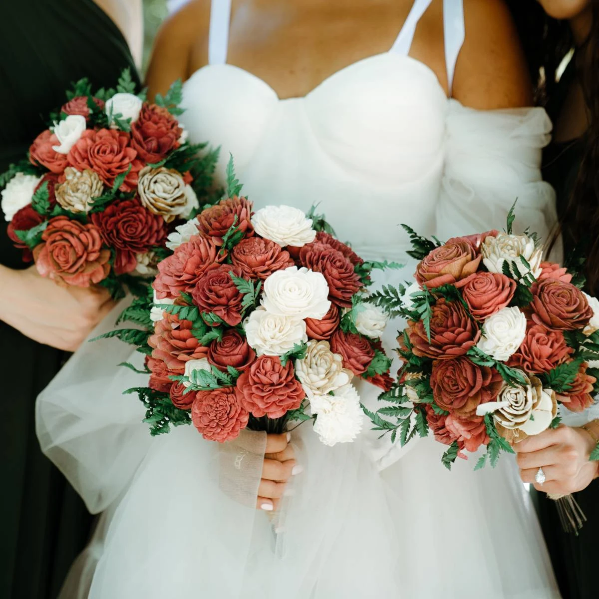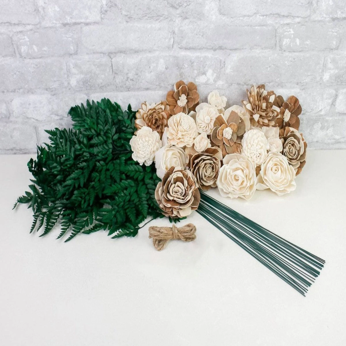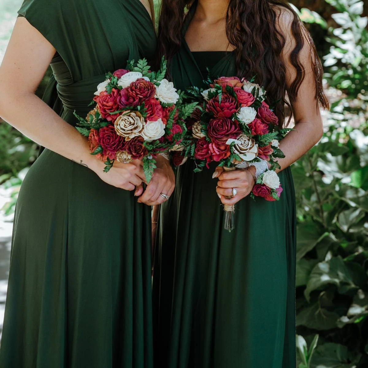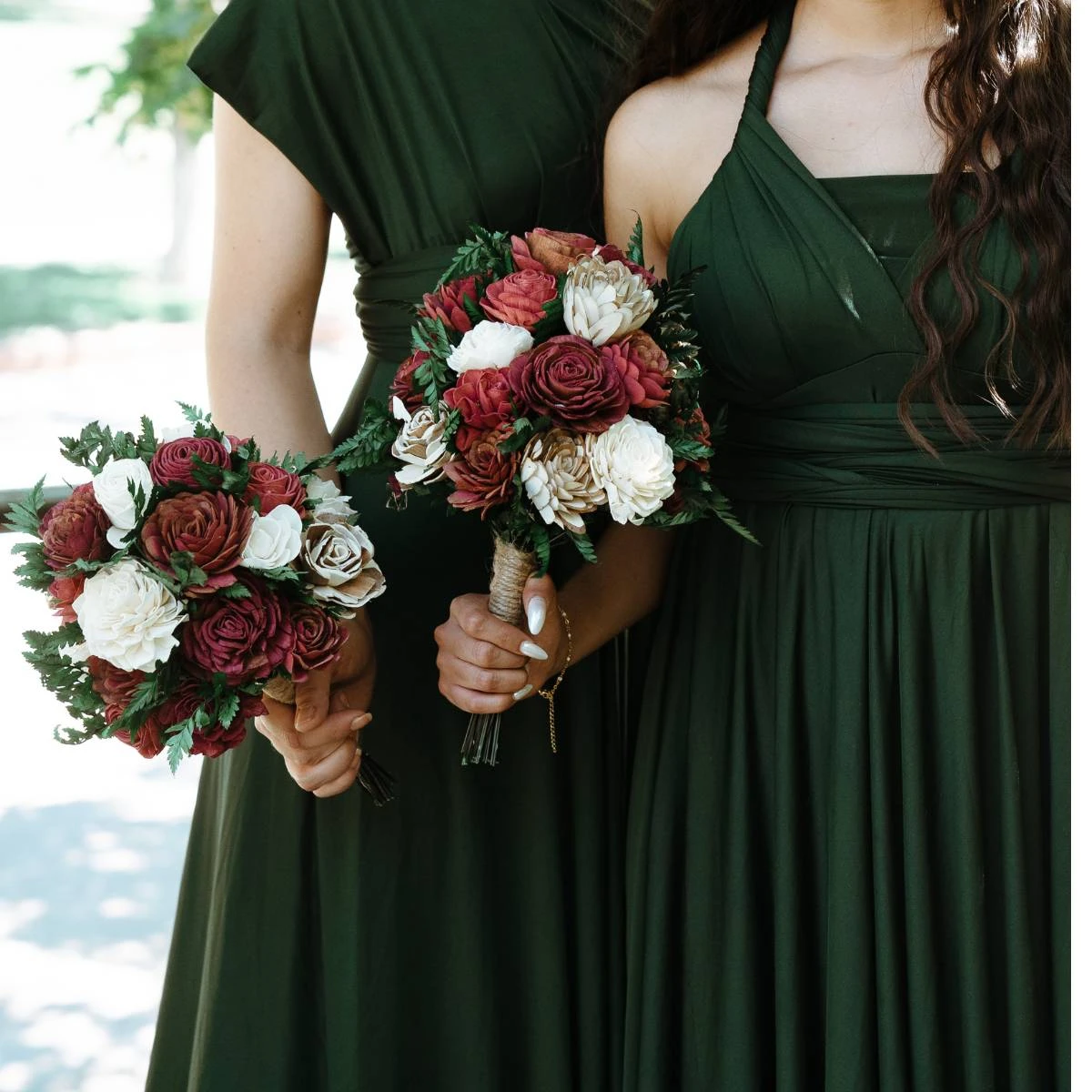 Our best selling romance themed bouquet is now available in a full bridal set! This gorgeous bridesmaid bouquet contains 30 of our stunning Sola Wood Flowers. Paired with our customer favorite Leather Leaf filler, this bridal bouquet kit is a show stopper! Perfect for large or small weddings! Select 2 colors from our 50+ dye options to match your wedding colors!