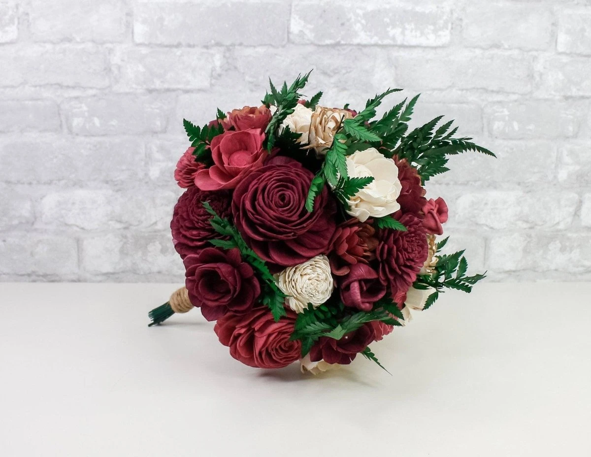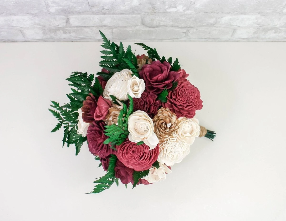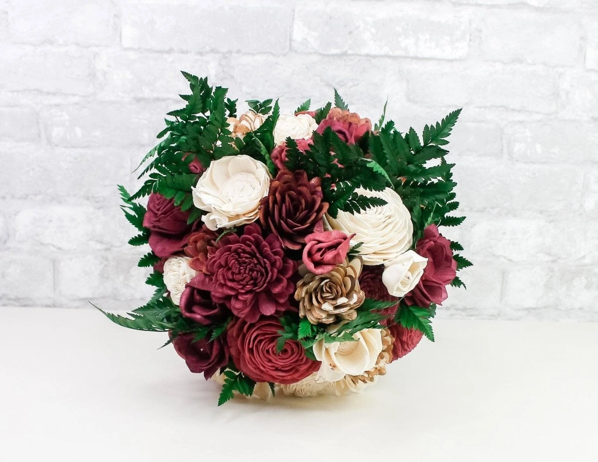 This gorgeous bridal bouquet contains 45 of our stunning Sola Wood Flowers dyed in Burgundy, Merlot, and Raw (No Dye) colors. Paired with our customer favorite Leather Leaf filler, this bouquet is a show stopper! Perfect for large or small weddings and Gifting!
