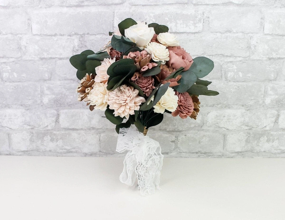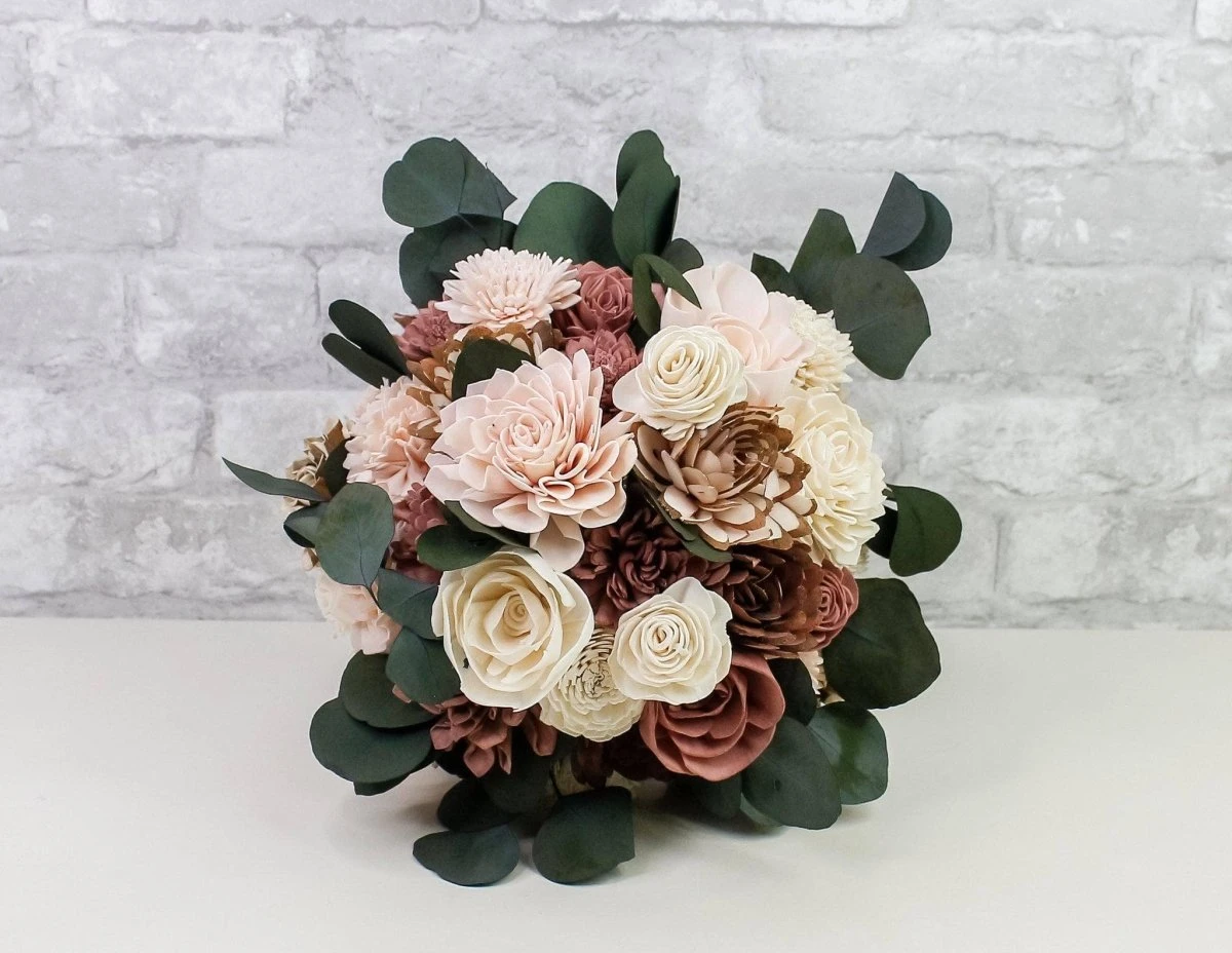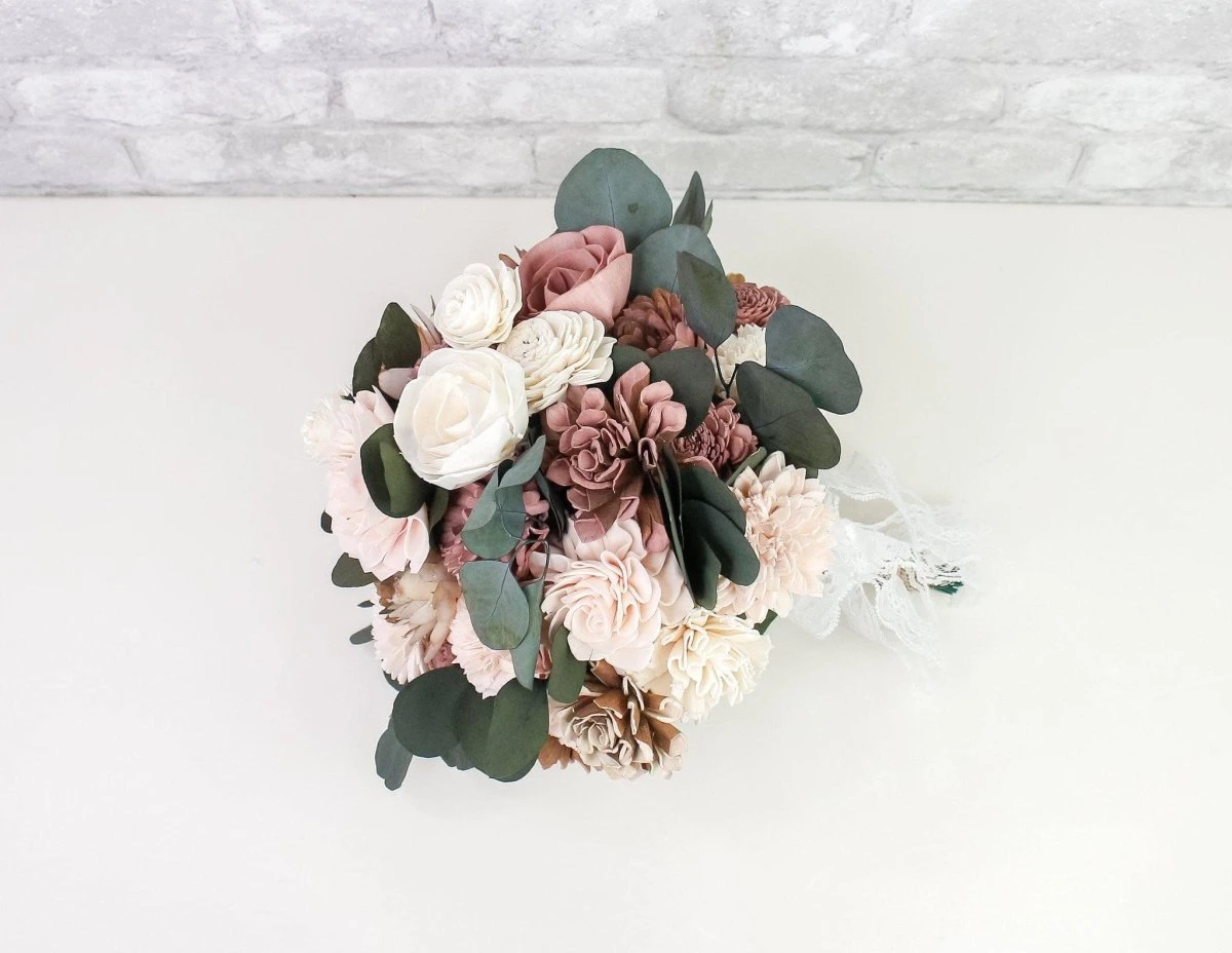 Our all time favorite filler the gorgeous Green Silver Dollar Eucalyptus is paired with a stunning assortment of sola wood flowers dyed in colors Mauve, Powder Pink, and Raw (No Dye).