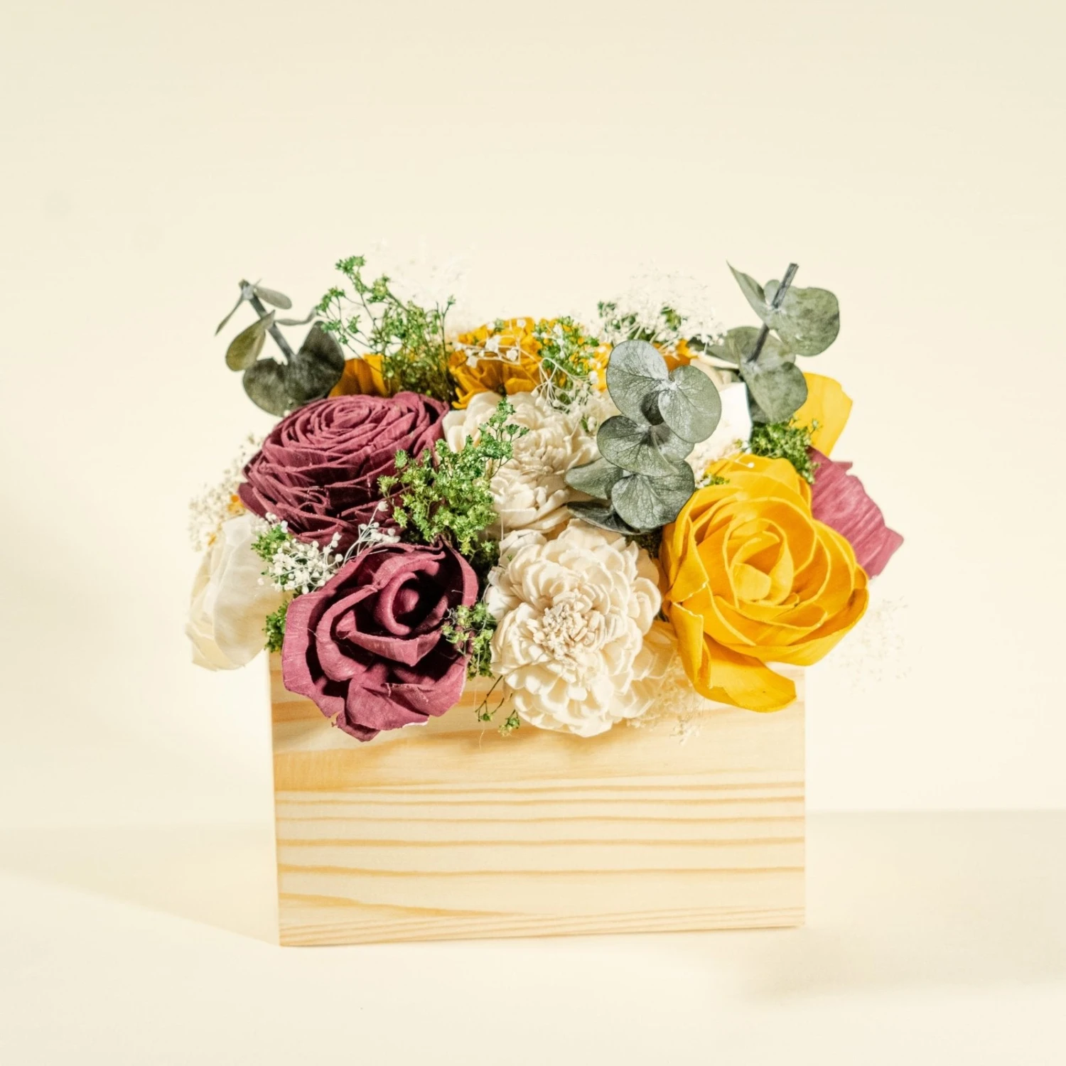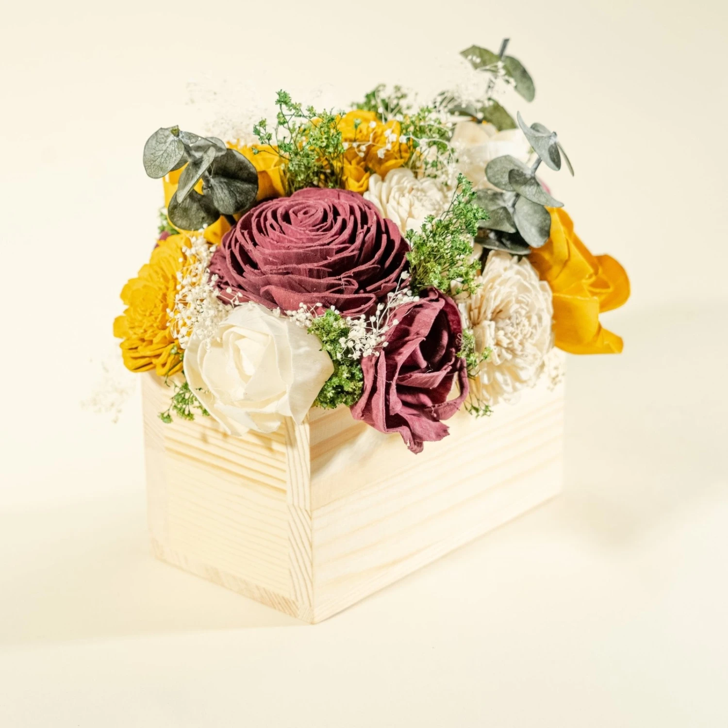 The colors used in the finished example shown are Merlot, Mustard, and Raw (No Dye). The stain we used for the centerpiece box is Raw.