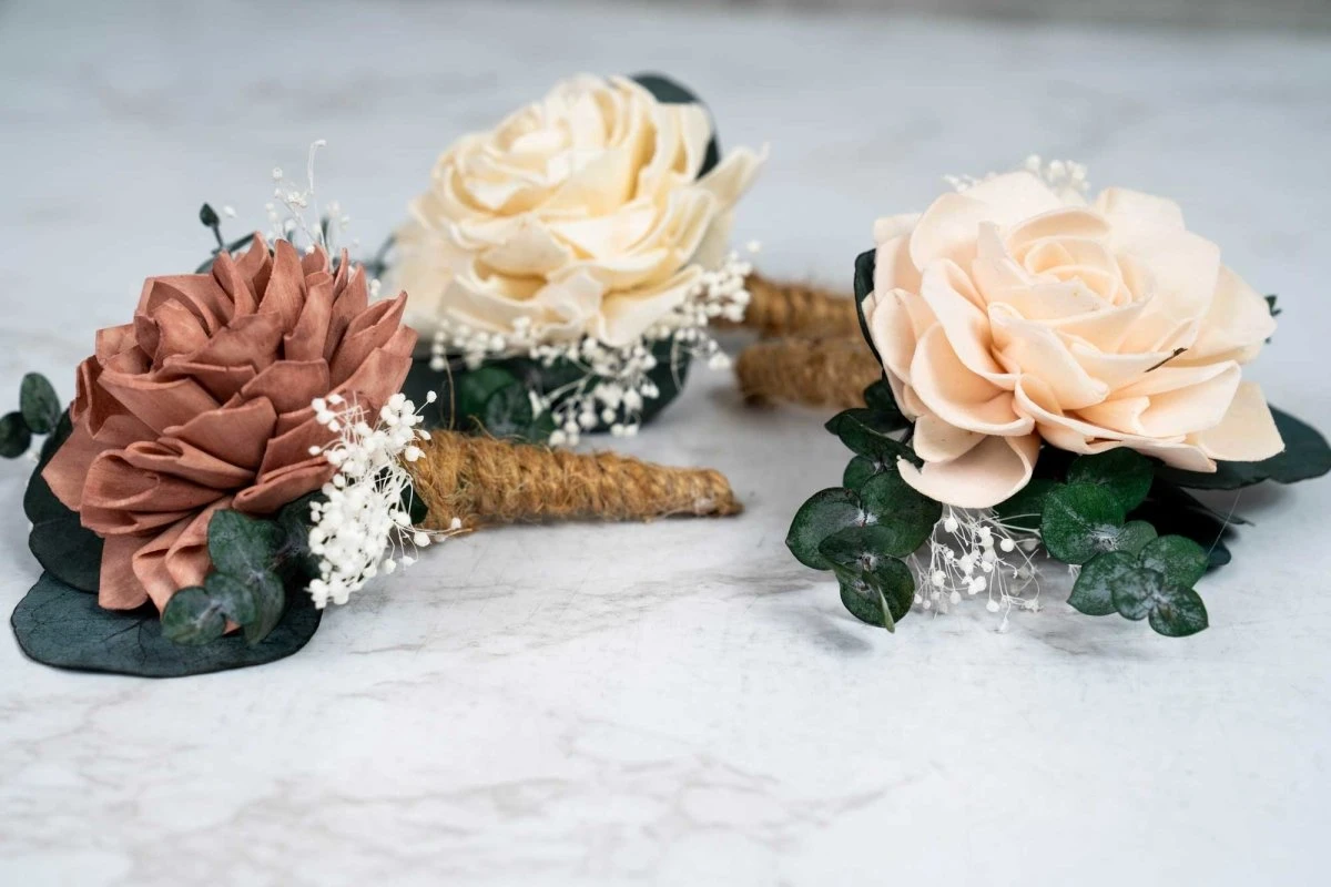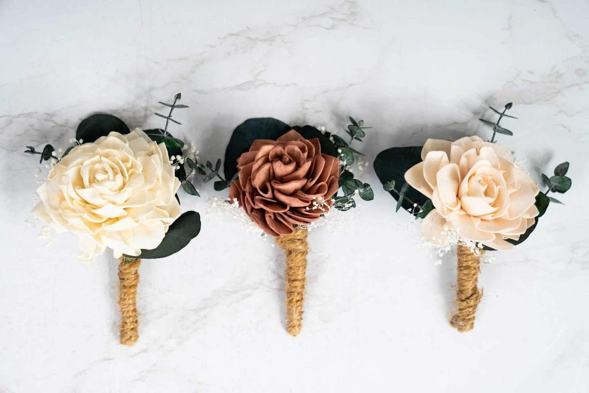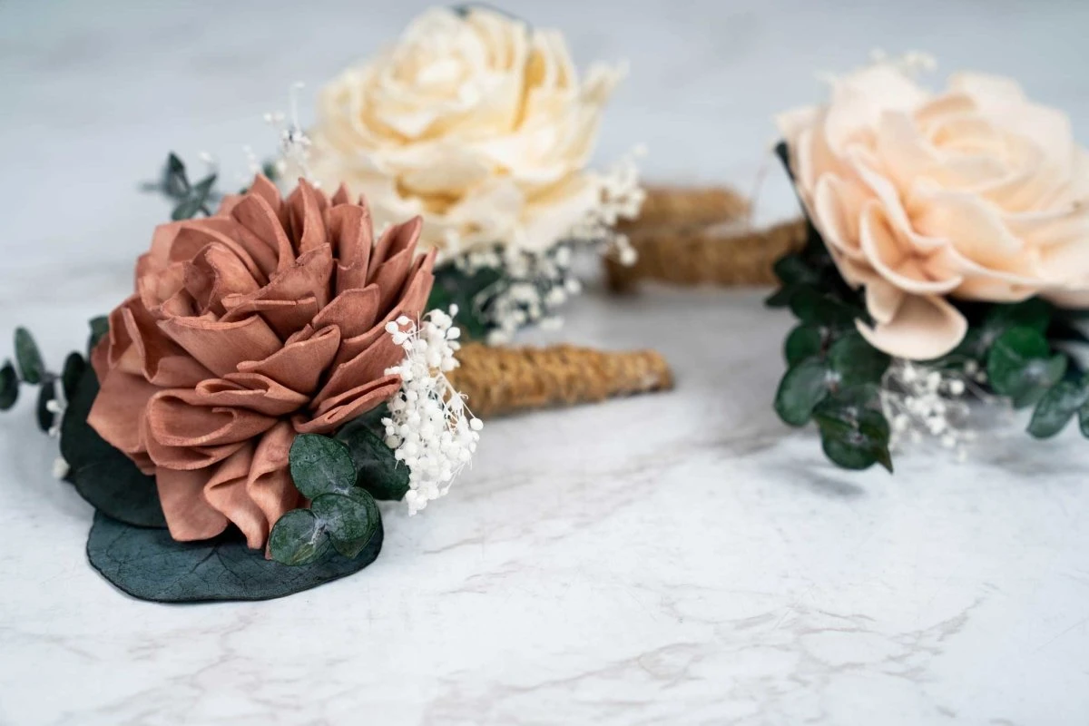 This father’s boutonniere, with its tastefully selected sola wood flowers and beautiful greenery, provides a touch of class, perfectly symbolizing the proud role on your special day.