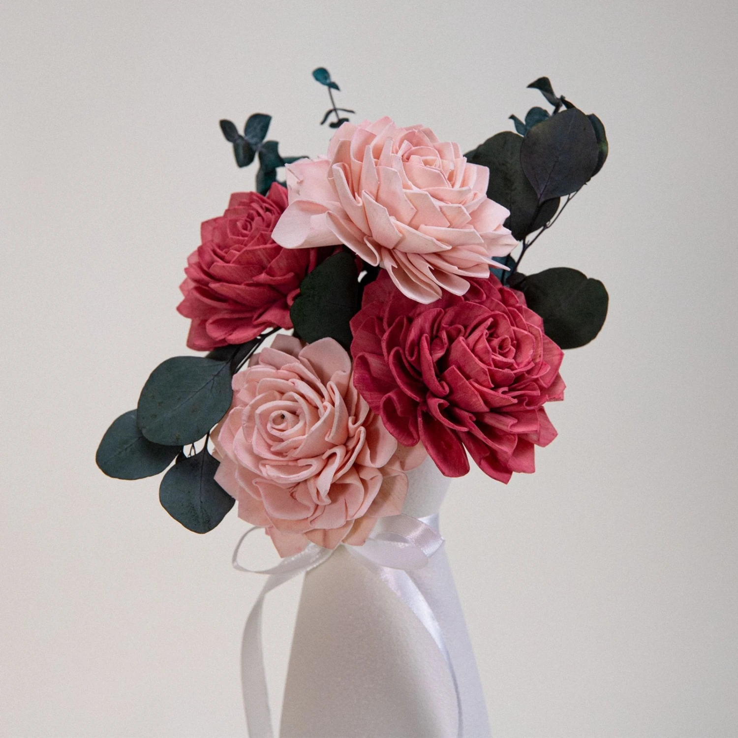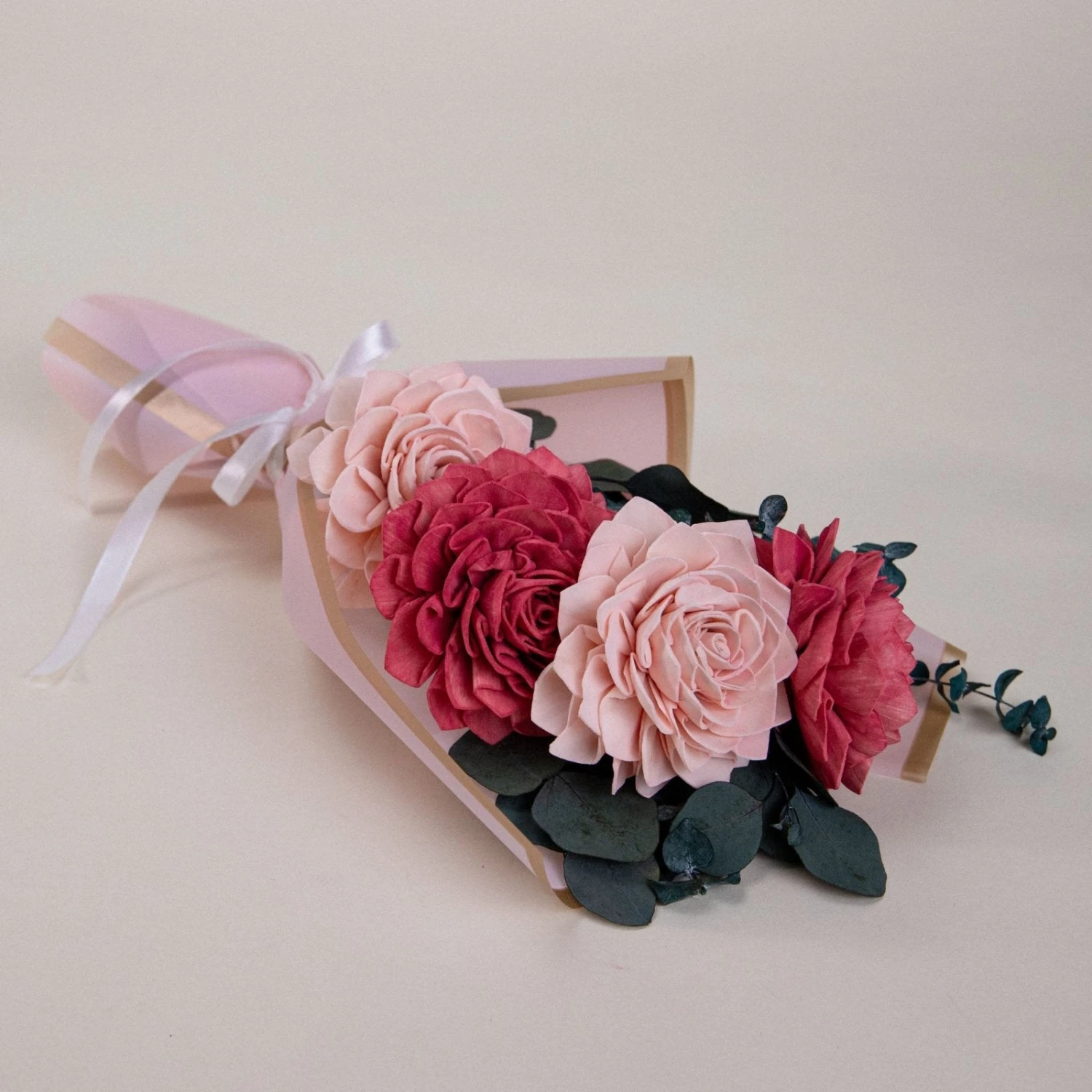 The gift Wrapped True Love Bouquet is absolutely gorgeous. The beautiful Dahlia flowers dyed in the colors Powder Pink, Heart Content are perfectly paired with 2 of our most popular Preserved Silver Dollar Eucalyptus – Green, Satin Washed Eucalyptus – Kelly Green preserved greenery/fillers giving this bouquet a larger than life look!