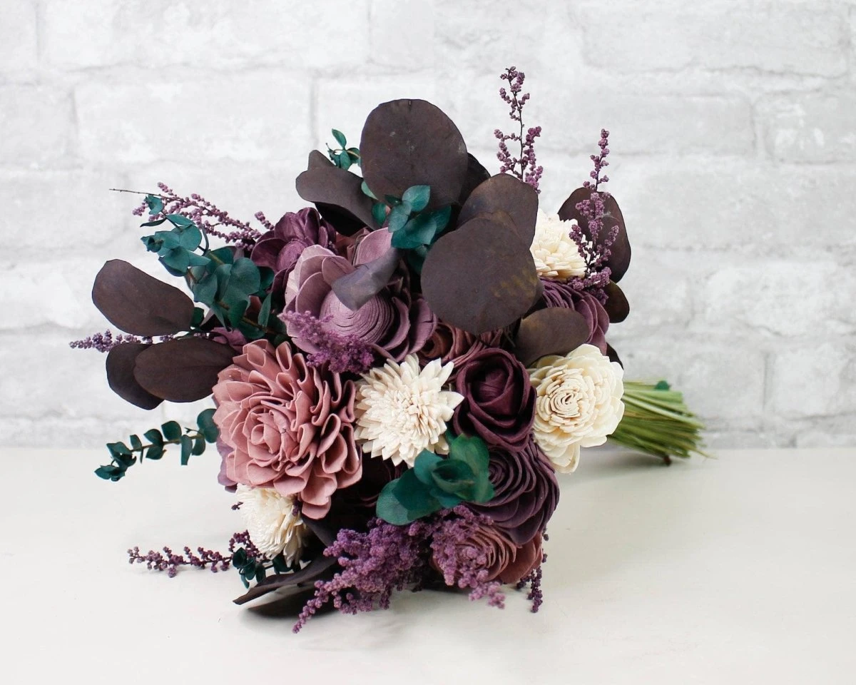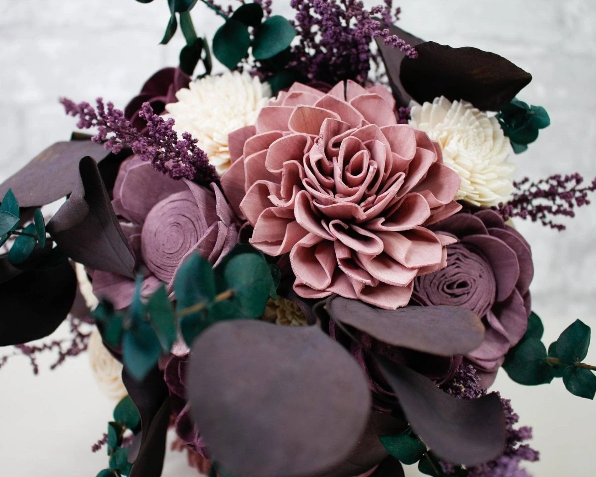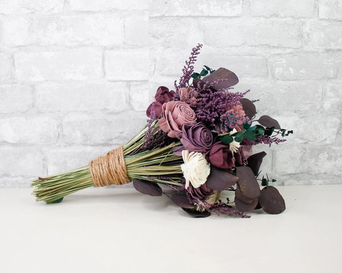 The Twilight Sky Bridesmaid bouquet is absolutely stunning. The combination of the preserved fillers, paired with our stunning wood flowers is gorgeous. This bouquet is perfect for the wedding party on your big day. In the finished example shown we used gorgeous Mauve and Plum colors that are perfectly complimented with the various fillers.