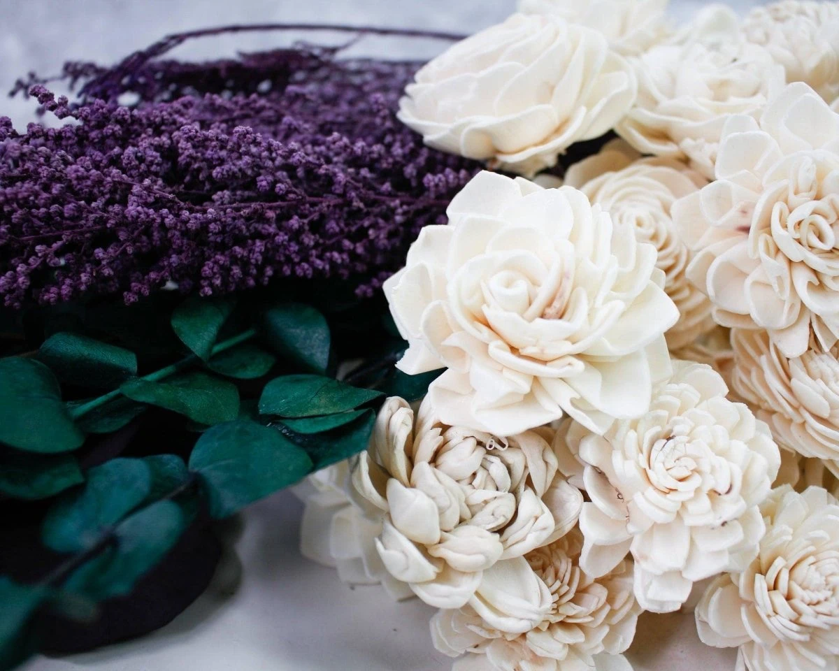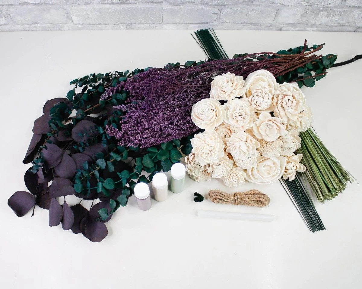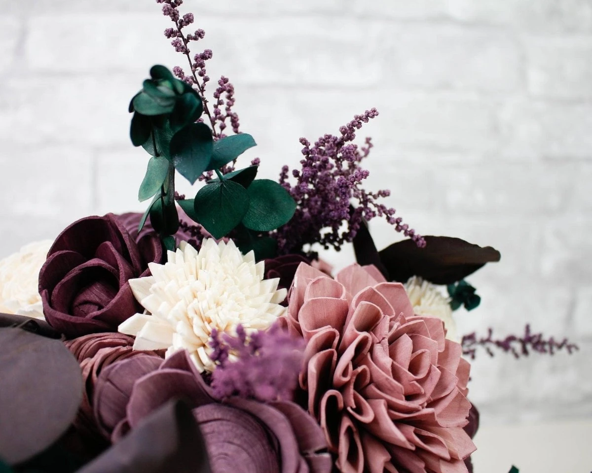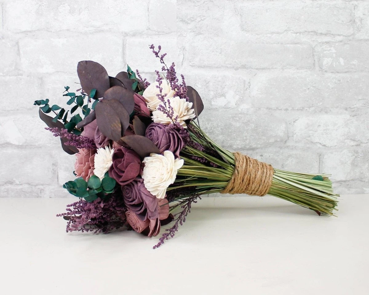 The Twilight Sky Bridesmaid bouquet is absolutely stunning. The combination of the preserved fillers, paired with our stunning wood flowers is gorgeous. This bouquet is perfect for the wedding party on your big day. In the finished example shown we used gorgeous Mauve and Plum colors that are perfectly complimented with the various fillers.